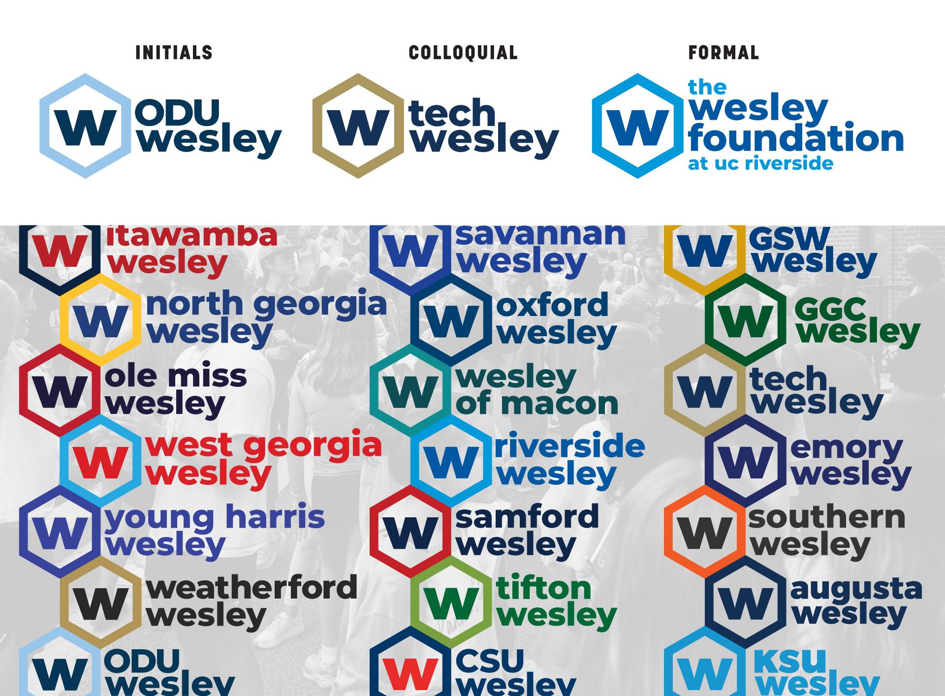 The on-campus organizations the Commission serves exist across an extremely diverse landscape. Colors, names, naming stipulations and more are all in flux from campus to campus. The logo system needed to be modular and customizable within controlled parameters to allow the individual programs to tailor their branding to their unique needs, as colors and even naming conventions varied from location to location. Montserrat being an open-source font was particularly important here as it made the files easily accessible and affordable for the individual Wesley Foundations, and easily sharable with their staff and students to help keep messaging and voice consistent.